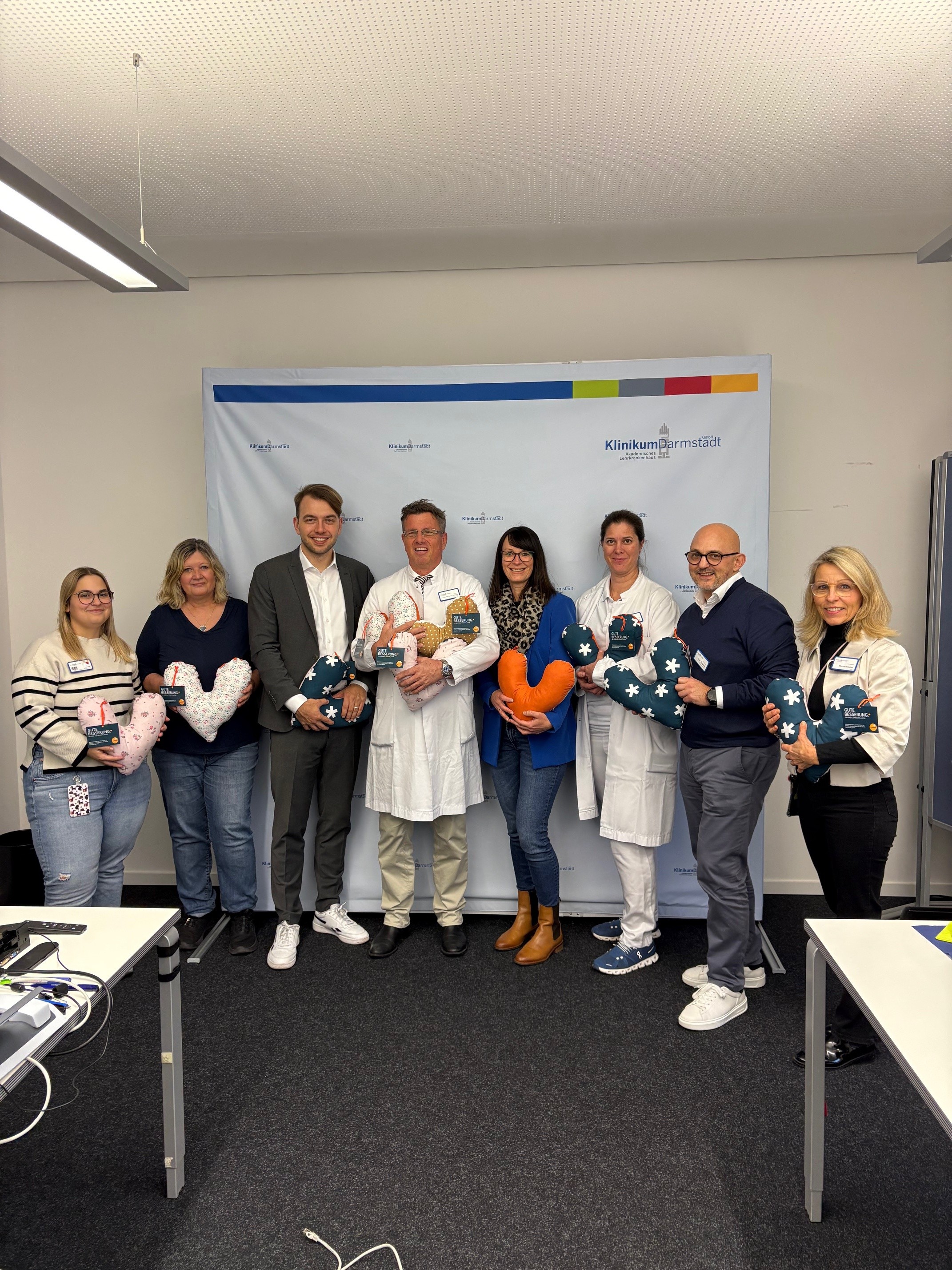 Die Herzkissen nahm PD Dr. med. Sven Ackermann, Direktor der Frauenklinik, entgegen. „Mein Team und ich bedanken uns herzlich für das langjährige Engagement der ENTEGA-Belegschaft. Die Herzkissen spenden Trost und Hoffnung.“