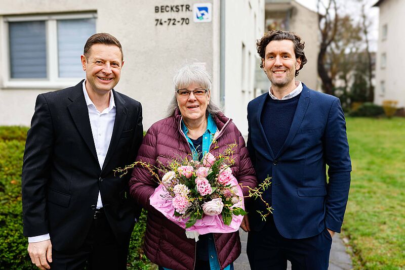 Die ENTEGA-Kundin Gabriele Illi konnte sich nicht nur über den ersten Glasfaseranschluss in einer Bauvereinsimmobilie freuen, sondern auch über einen Blumenstrauß, den Stefan Backmund, Bereichsleiter des Bestandsmanagement der bauverein AG, und Christoph Busch anlässlich der offiziellen Inbetriebnahme persönlich überreichten. „Mir war wichtig, meine Verbundenheit zur Stadt Darmstadt und zum regionalen Anbieter ENTEGA zu stärken. Jetzt bin ich gespannt, wie sich die höhere Geschwindigkeit auf das Surfen im Netz, das Streaming von Videos oder andere Online-Aktivitäten auswirken wird. Zudem freue ich mich darauf, dass der Glasfaseranschluss stabil ist, auch wenn viele Nutzer gleichzeitig online sind“, sagte Gabriele Illi.