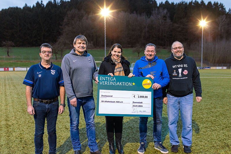 BERGSTRAßE (ac) – Der Ökoenergie- und Telekommunikationsversorger ENTEGA hat den jeweils regionalen Erstplatzierten der Ende 2023 zum achten Mal stattgefundenen ENTEGA Vereinsaktion offiziell prämiert. Für die Region Bergstraße ist der SV Affolterbach 1928 e.V. mit einem Preisgeld in Höhe von 2.000 Euro zum Sieger ausgezeichnet worden und konnte nun persönlich den Siegerscheck in Empfang nehmen. Bei dem Online-Wettbewerb, der ganz bewusst erneut unter dem Motto „Stark im Verein, stark fürs Klima“ gestanden hat und somit den Klimaschutz wieder in den Vordergrund stellt, konnten regionale Vereine die Öffentlichkeit über ihre dazu passenden Projekte abstimmen lassen.