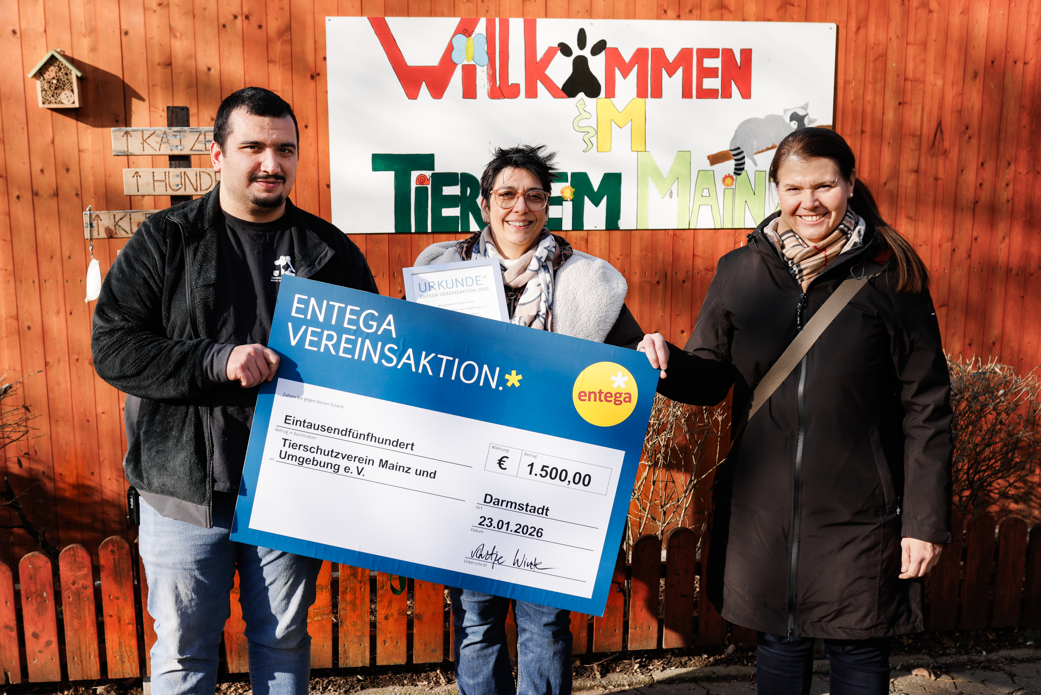 MAINZ (ac) – Der Ökoenergie- und Telekommunikationsversorger ENTEGA hat den jeweils regionalen Erstplatzierten der Ende 2025 zum zehnten Mal stattgefundenen ENTEGA Vereinsaktion offiziell prämiert. Für die Region Mainz ist der Tierschutzverein Mainz und Umgebung e.V. mit einem Photovoltaik-Projekt und einem Preisgeld in Höhe von 1.500 Euro zum Sieger ausgezeichnet worden und konnte nun persönlich den Siegerscheck in Empfang nehmen. Bei dem Online-Wettbewerb, der bewusst erneut unter dem Motto „Stark im Verein, stark fürs Klima“ gestanden hat und somit den Klimaschutz wieder in den Vordergrund stellt, konnten regionale Vereine die Öffentlichkeit über ihre dazu passenden Projekte abstimmen lassen.