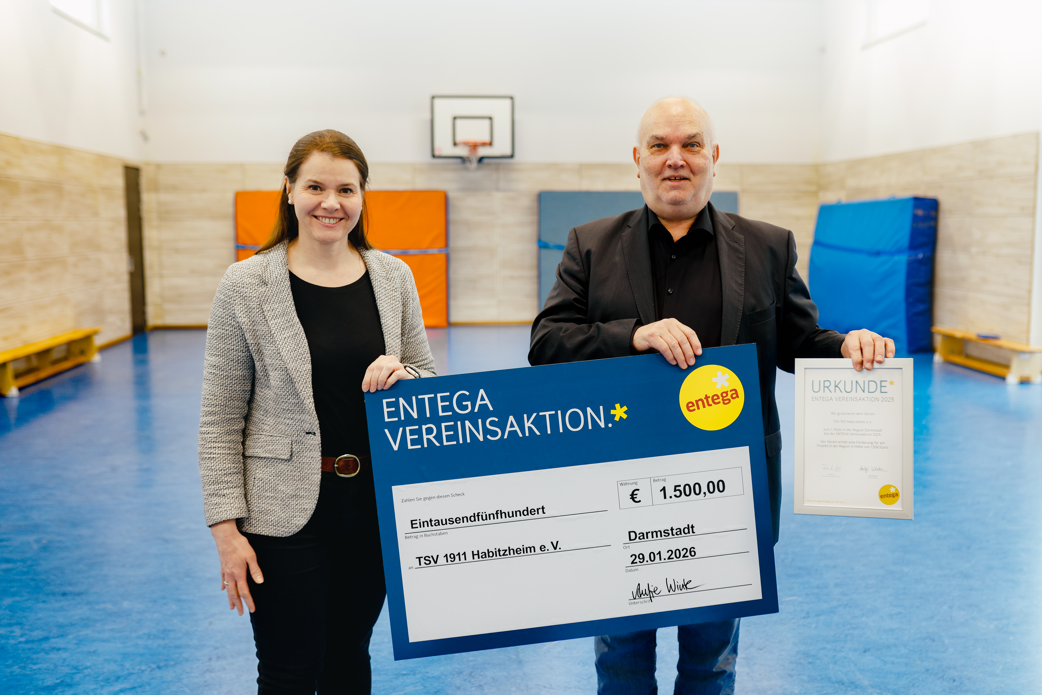 DARMSTADT (ac) – Der Ökoenergie- und Telekommunikationsversorger ENTEGA hat den jeweils regionalen Erstplatzierten der Ende 2025 zum zehnten Mal stattgefundenen ENTEGA Vereinsaktion offiziell prämiert. Für die Region Darmstadt ist der TSV 1911 Habitzheim e.V. mit einem Photovoltaik-Projekt und einem Preisgeld in Höhe von 1.500 Euro zum Sieger ausgezeichnet worden und konnte nun persönlich den Siegerscheck in Empfang nehmen. Bei dem Online-Wettbewerb, der bewusst erneut unter dem Motto „Stark im Verein, stark fürs Klima“ gestanden hat und somit den Klimaschutz wieder in den Vordergrund stellt, konnten regionale Vereine die Öffentlichkeit über ihre dazu passenden Projekte abstimmen lassen.