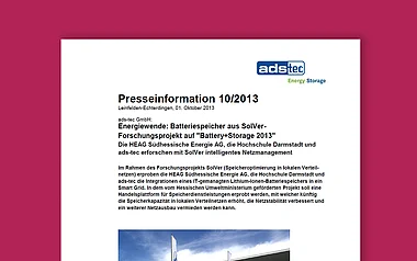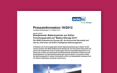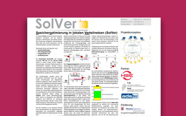 Für die Zuverlässigkeit der Stromversorgung durch regenerativ erzeugte Energie spielen Speichertechnologien eine zunehmend wichtige Rolle. Gerade eine schwankende Einspeisung ins Stromnetz erfordert ein optimales Erzeugungs-, Speicher- und Lastmanagement. Überschüssiger Strom aus erneuerbaren Energien kann bei geringer Nachfrage in Batterien gespeichert werden und wird anschließend genutzt, sobald die Nachfrage die Produktion übersteigt. Um künftig Speicherkapazitäten in lokalen Verteilnetzen zu optimieren, initiierte der Darmstädter Energieversorger gemeinsam mit der Hochschule Darmstadt und dem Batteriehersteller ads-tec das Pilotprojekt „SolVer“. In dem vom Hessischen Wirtschaftsministerium geförderten Projekt wird ein Expertenteam in 28 Monaten eine unabhängige Handelsplattform für Speicherdienstleistungen entwickeln, die unter anderem zur Netzstabilität, Vermeidung von Netzausbau und Bereitstellung von Regelenergie beiträgt.